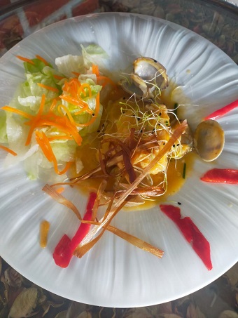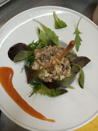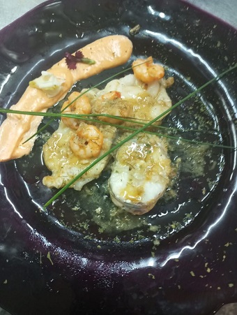 *Revuelto de manzana. *Ojaldre relleno de crema de marisco horneado. *Corona de hongos con patatas laminadas.