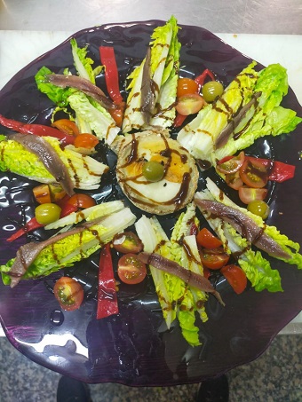 *Ensalada de cogollos con ventresca, pimientos de piquillo, anchoas y queso de cabra.