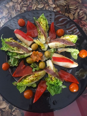 *Ensalada de cogollos con pimiento piquillo y anchoas.....(14€).